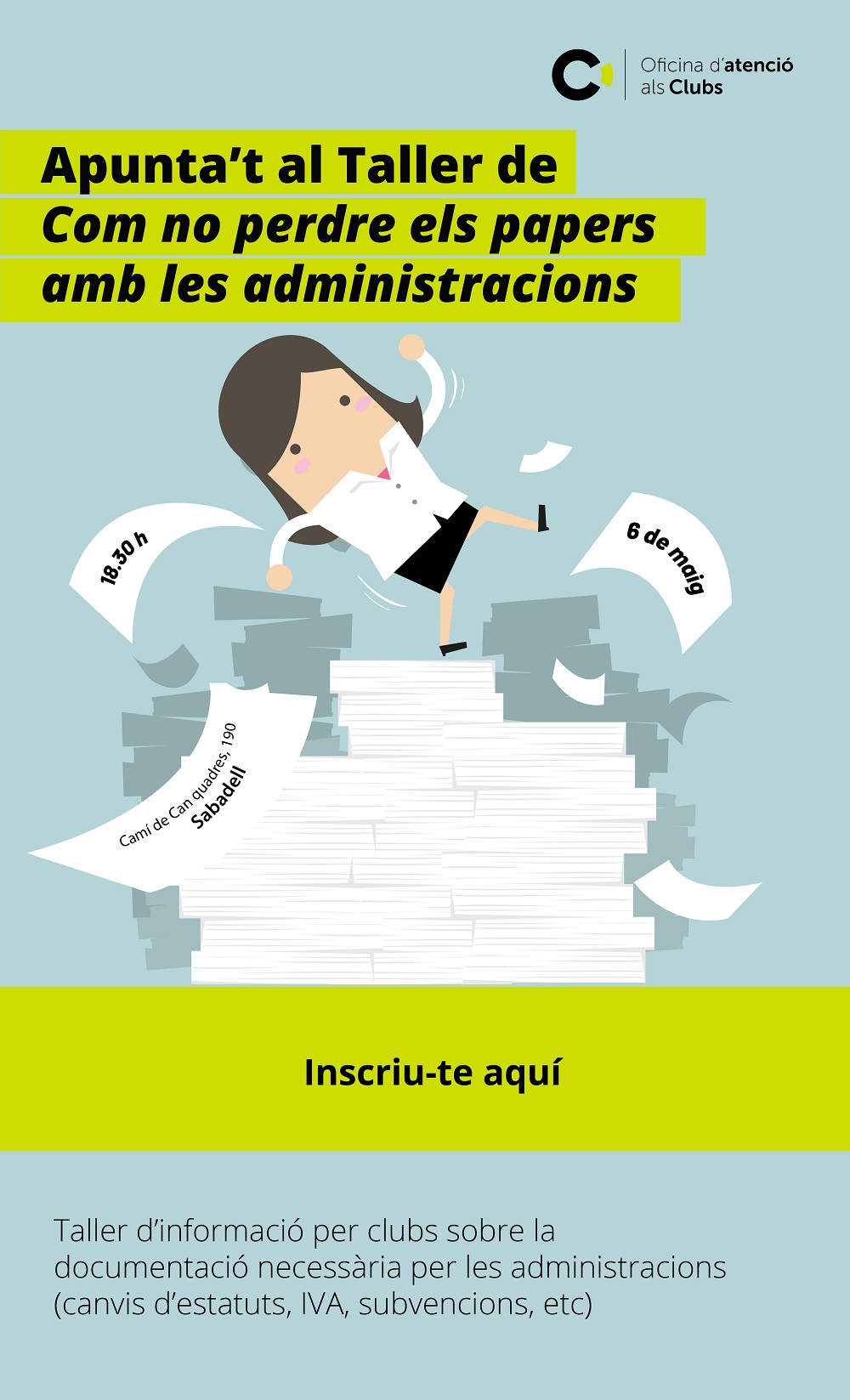 L’Oficina d’Atenció al Clubs, ofereix el proper 6 de maig a les 18:30 h, un taller formatiu sota el títol Com no perdre els papers amb les administracions. L’objectiu és orientar als clubs de com han de fer els tràmits alhora de presentar documentació per demanar subvencions als ajuntaments, per gestionar temes fiscals amb hisenda o bé quan han de fer canvis en els estatuts.