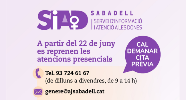 Aquest dilluns 22 de juny s'han reprès les atencions presencials al Servei d'Informació i Atenció a les Dones (SIAD), ubicat al carrer de Vidal, 146. Les persones que hi estiguin interessades, han de demanar cita prèvia al telèfon 93 724 61 67 o per correu electrònic a genere@ajsabadell.cat.