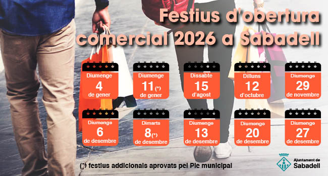 Us recordem els dies festius d'obertura comercial per al 2026 a Sabadell. A més dels que fixa la Generalitat de Catalunya, el Ple municipal de 28 de juliol de 2025 ha acordat fixar els dies 11 de gener i 8 de desembre com a dos dies festius addicionals d'obertura comercial autoritzada per a l'any 2026.