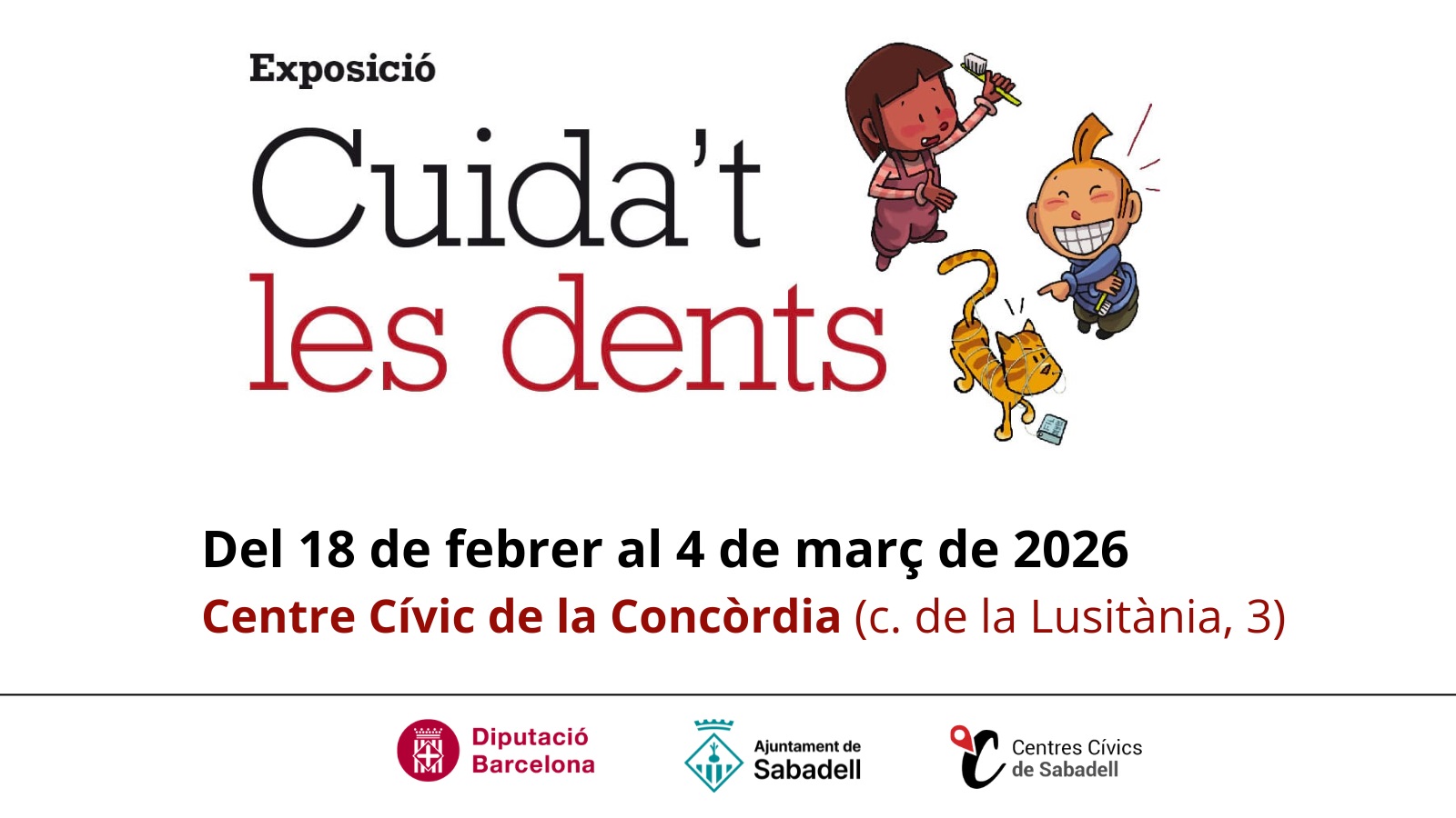 De dimecres 18 de febrer de 2026 a dimecres 4 de març de 2026, horari centre cívicL'exposició torna a Sabadell en el marc del programa municipal Somriures saludables, amb l'objectiu de fomentar uns bons hàbits d'higiene i d'alimentació entre els infants, claus per mantenir una bona salut bucodental.