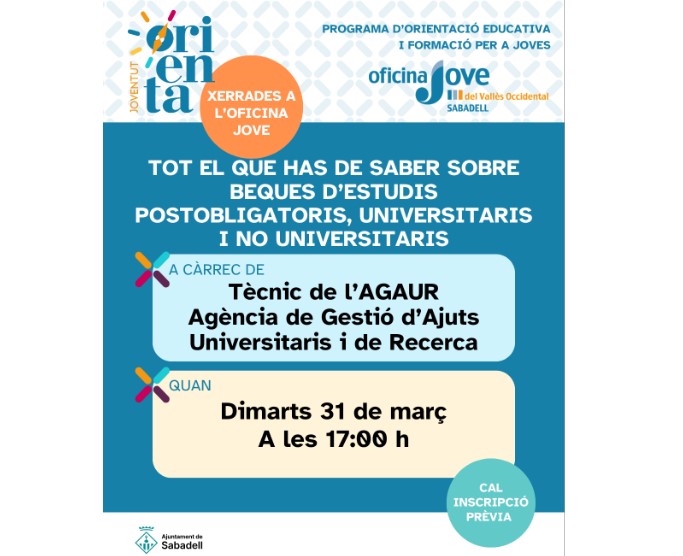 Dimarts 31 de març de 2026, de 17 a 18.30 hXERRADA DEL PROGRAMA JOVENTUT ORIENTA.