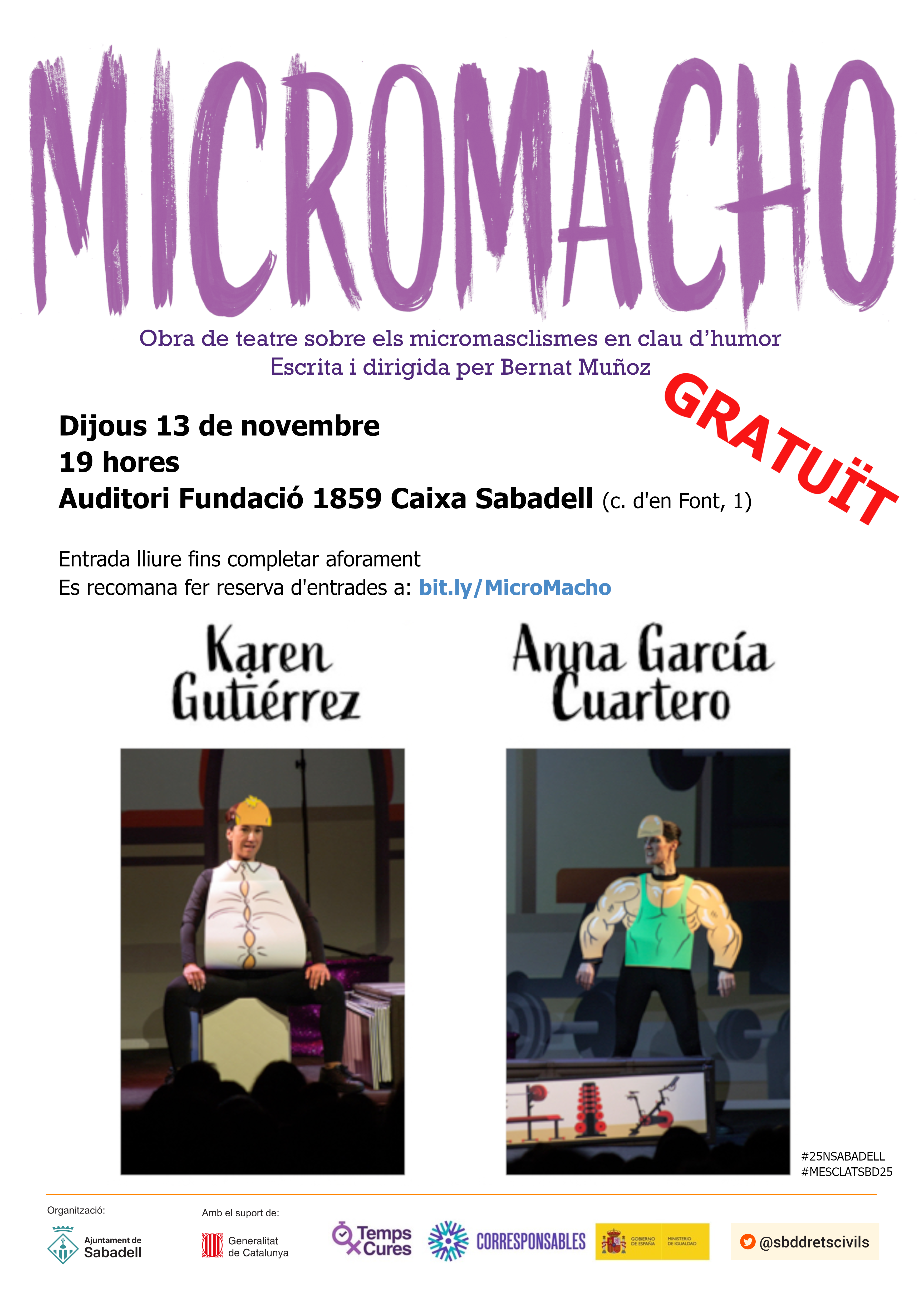 Micromacho, una obra de teatre sobre els micromasclismes en clau d’humor. Escrita i dirigida per Bernat Muñoz i representada per Karen Gutierrez i Anna Garcia Cuartero, de la companyia de teatre Kamaleonik.