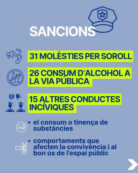 La major part de les sancions estan relacionades amb molèsties per soroll (31) i amb el consum d’alcohol a la via pública (26), especialment en zones amb més activitat d’oci nocturn.