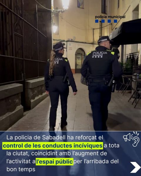 La Policia Municipal de Sabadell ha reforçat la seva presència a tots els barris de la ciutat per prevenir conductes incíviques, coincidint amb l’increment d’activitat a l’espai públic per l’arribada del bon temps.
