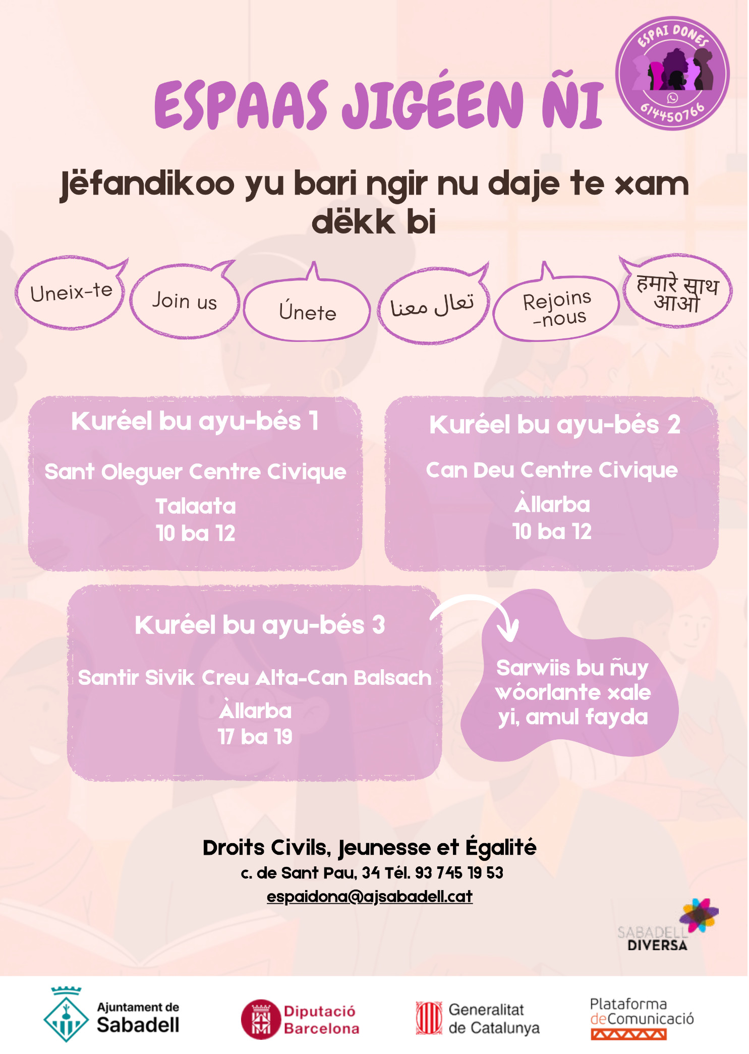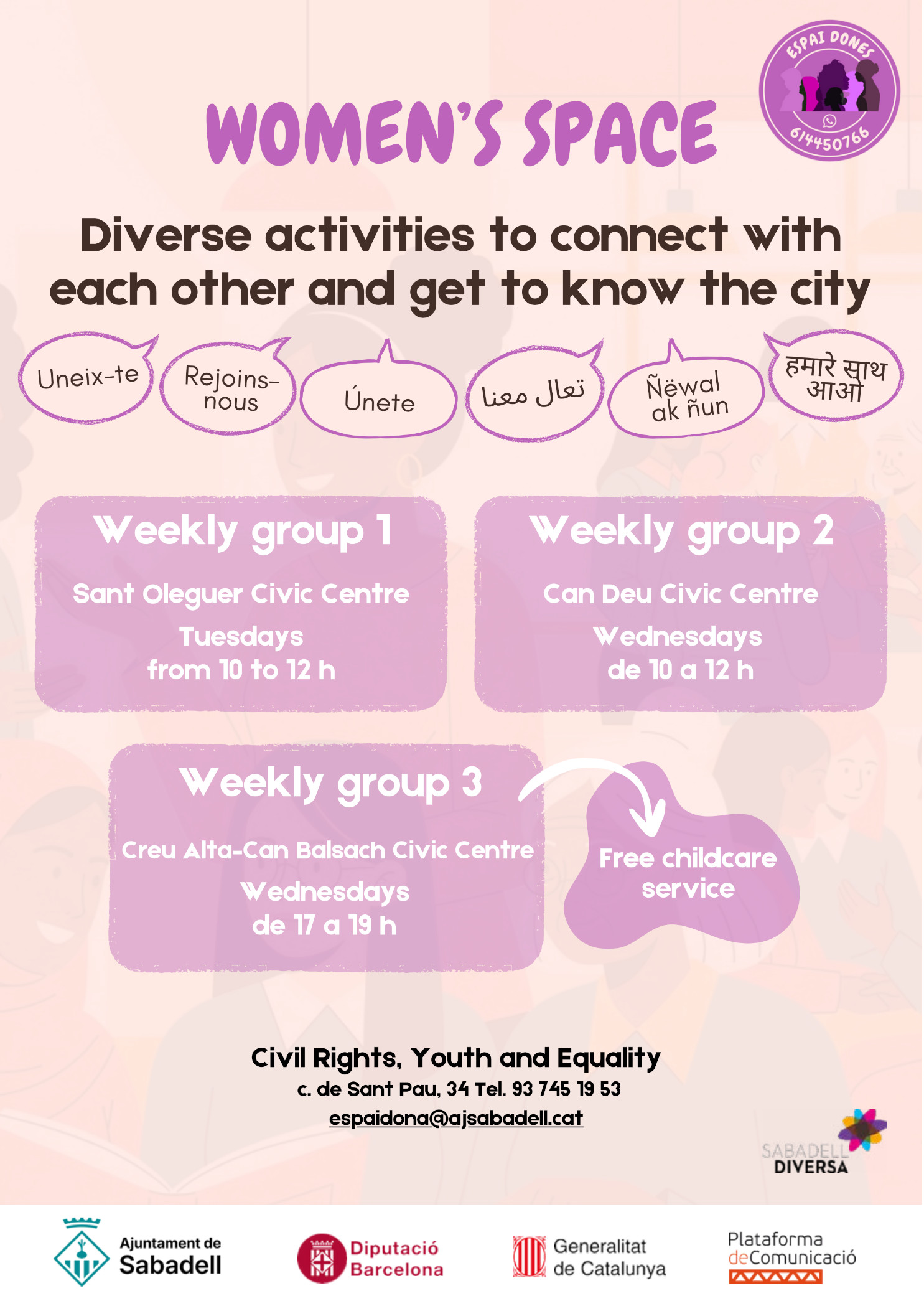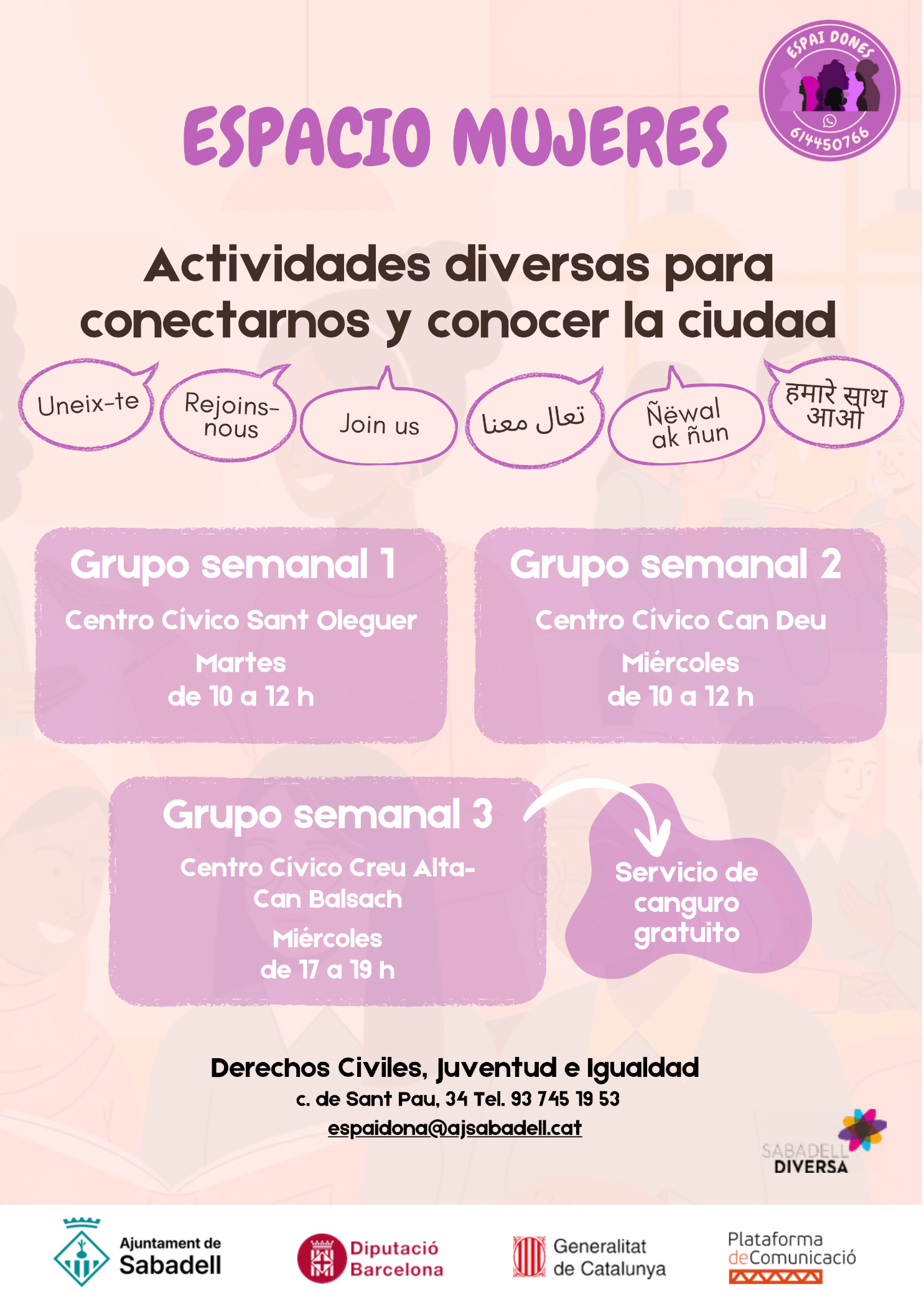 Està dirigit a dones adultes, que fa poc temps que han arribat a Sabadell, o que passat un temps des de l’arribada, es troben amb manca de vinculació al territori, manca d’autonomia i coneixements de la ciutat, i/o tenen ganes de avançar en el seu procés migratori, amb més aprofundiment i en xarxa amb altres dones.