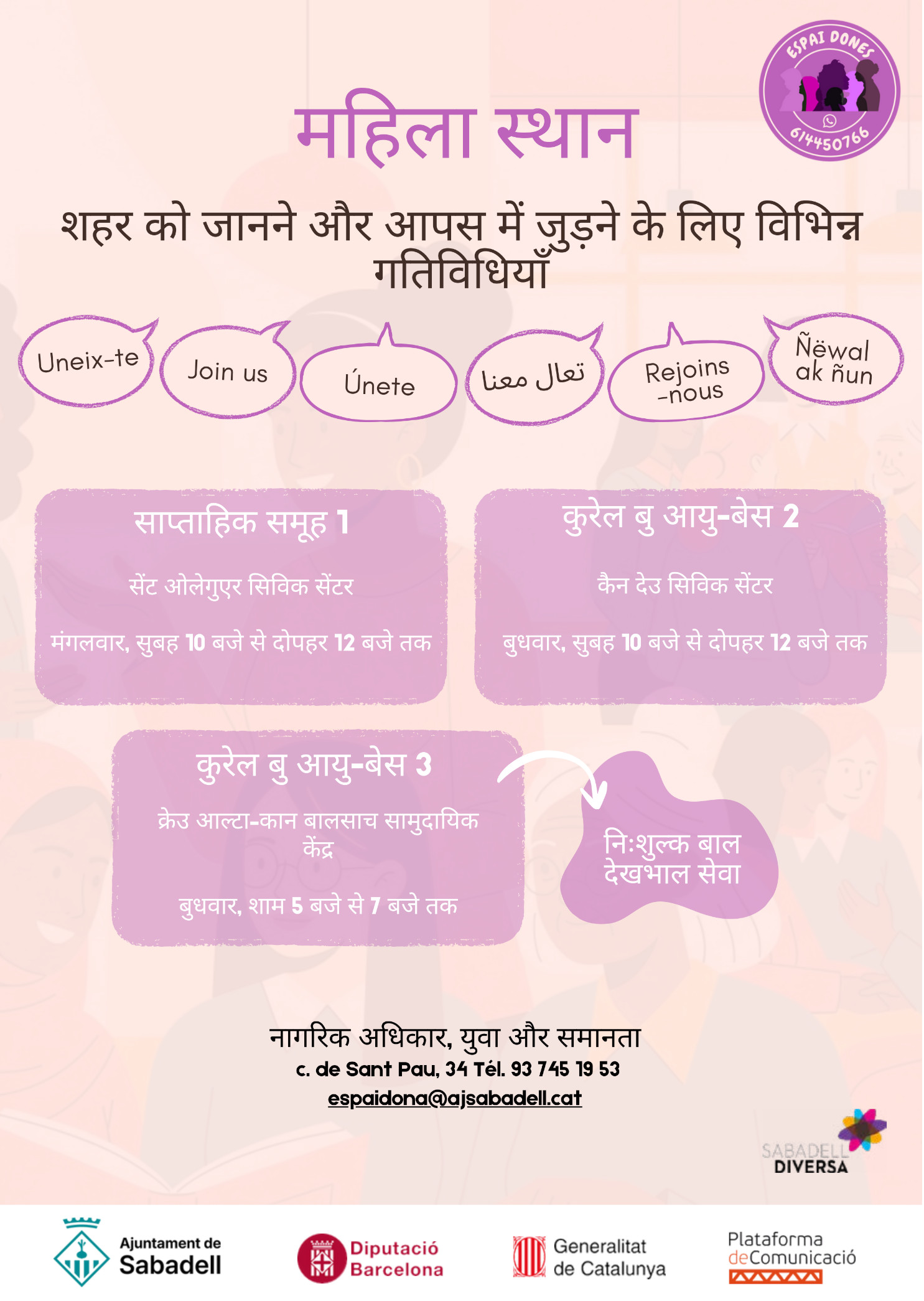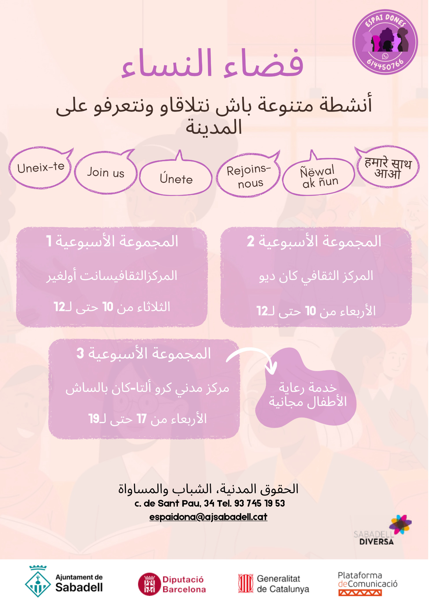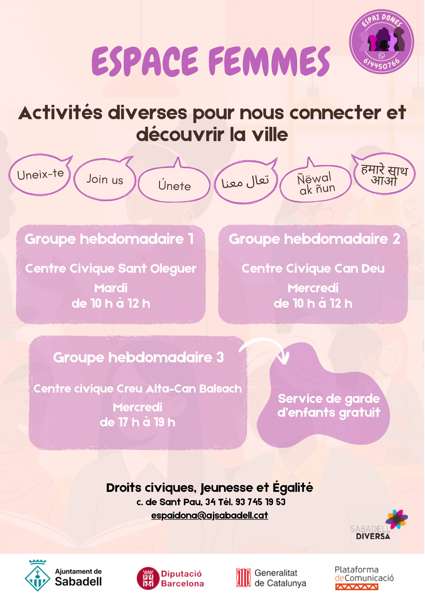 Està dirigit a dones adultes, que fa poc temps que han arribat a Sabadell, o que passat un temps des de l’arribada, es troben amb manca de vinculació al territori, manca d’autonomia i coneixements de la ciutat, i/o tenen ganes de avançar en el seu procés migratori, amb més aprofundiment i en xarxa amb altres dones.