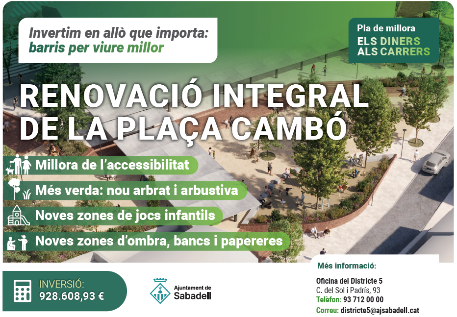 L'Ajuntament de Sabadell impulsa la renovació integral de la plaça de Cambó, amb l'objectiu de millorar la qualitat de l'espai públic i fer-lo més accessible, verd i adaptat a les necessitats del veïnat.