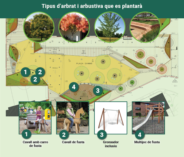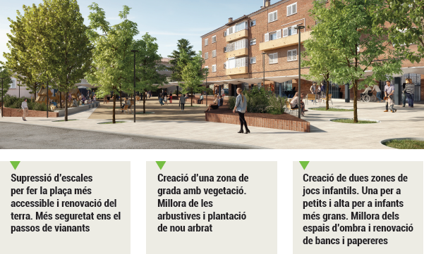 La proposta de remodelació preveu una transformació significativa de la plaça, amb actuacions com la millora de l'accessibilitat mitjançant la supressió d'escales i la renovació del paviment, l'increment del verd amb nou arbrat i arbustiva, la creació d'una zona de grada amb vegetació, la incorporació de noves zones de joc infantil diferenciades per edats, i la millora dels espais d'ombra, bancs i papereres. Tot plegat amb l'objectiu de garantir més seguretat en els recorreguts de vianants i fomentar l'ús quotidià de la plaça com a espai de trobada i convivència.